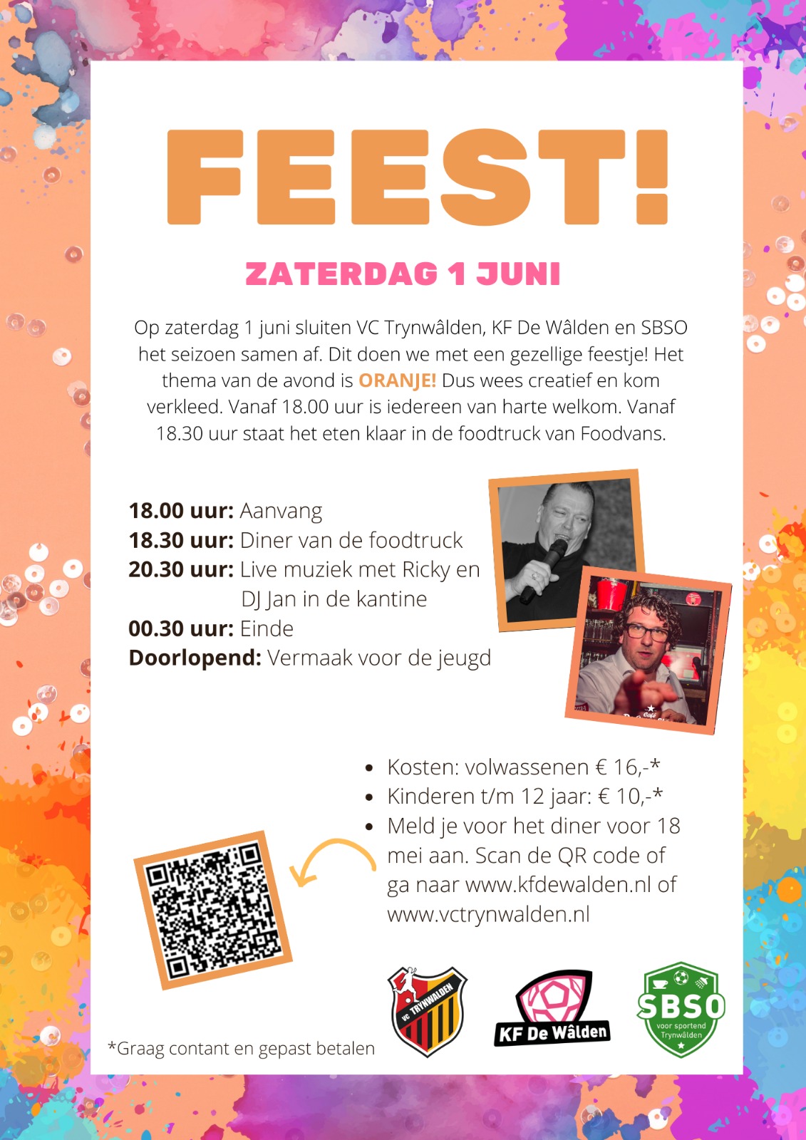 Samen met KF De Wâlden en de SBSO sluiten we dit sportseizoen gezamenlijk af in het Oranje! Om 18:30 kunnen jullie komen dineren van de foodtruck, maar geef je nog wel even op via de aanmeldlink voor 18 mei!